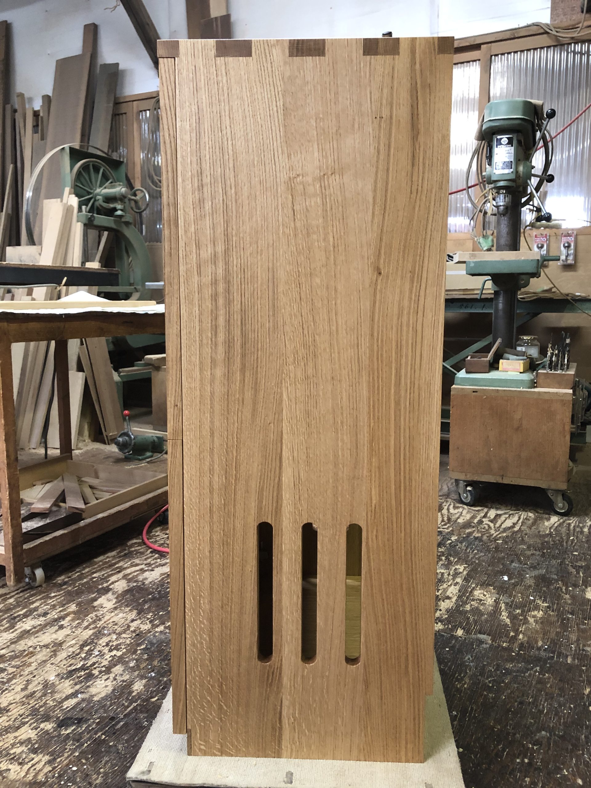 本体はオーク材の柾板を使い天板には斑入りの板を使って、ちょっと表情を作ってみました。