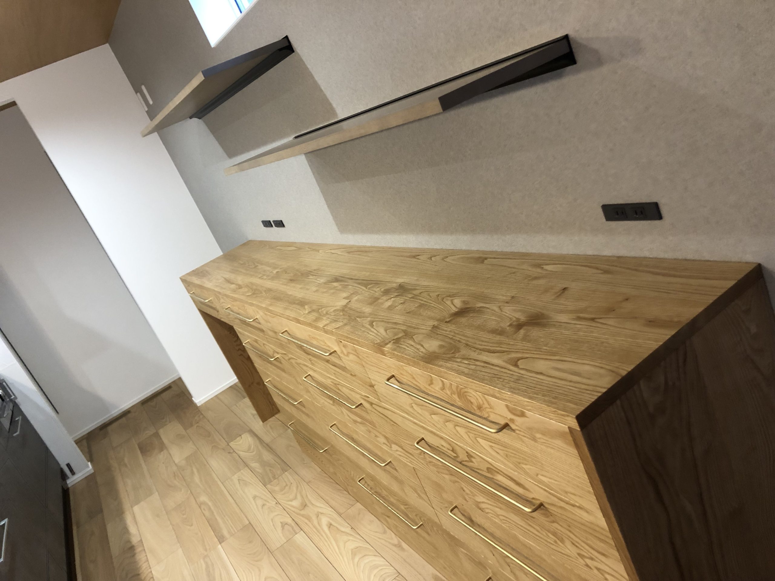 今回のキッチンボードは、3mと長いので、天板と引き出し部分を分割して製作することにしました。搬入も大変になりますので。