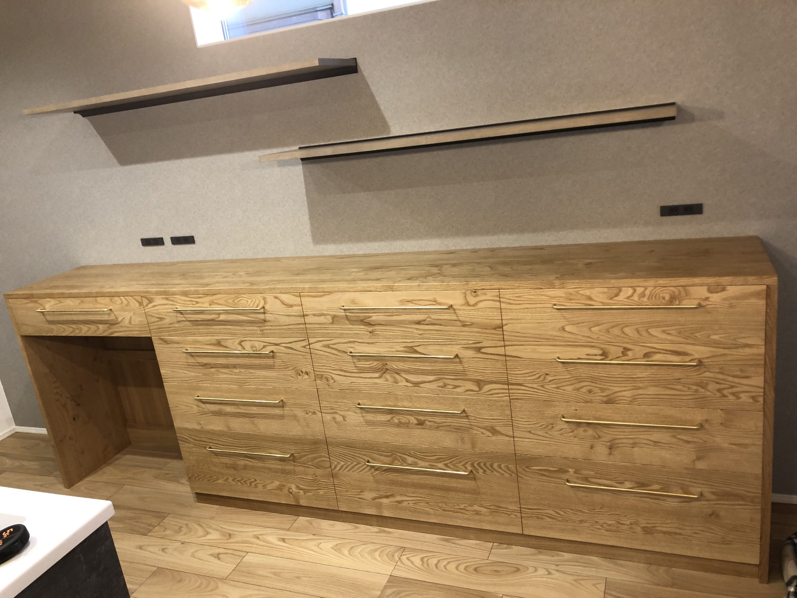 後は、梅雨時期の製作になってしまいましたので、製作時は少し部材が伸びた状態だと思うので、抽斗の前板は、ぎりぎりの加工にして完成前に鉋で削って調整することにしましたが、思ったよりも縮まなくて2・3日かけて少しずつ削り調整しましたが、納品設置の時もまだ擦っていましたが、使われるまで少し時間がある様でしたので、使われる前までそのままにしてもらうことにして、使われる直前に最終の調整をさせていただきました。
