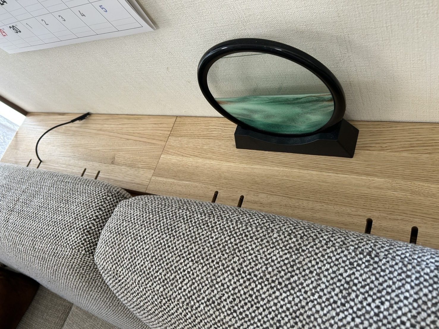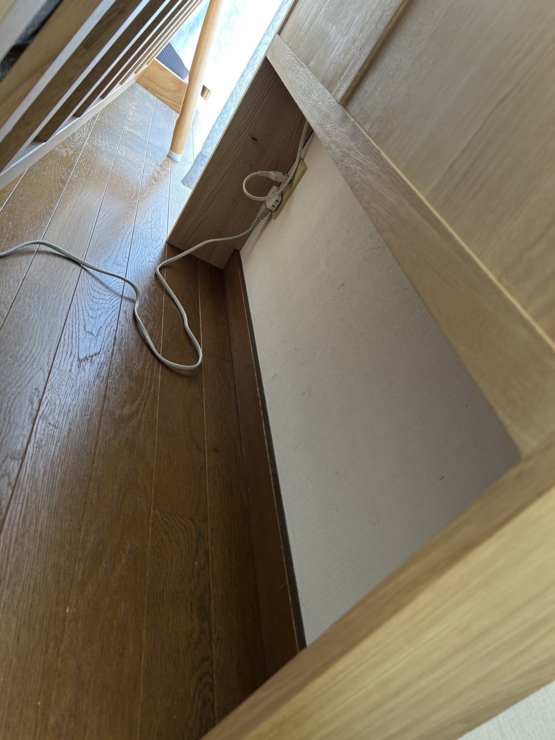 蓋の部分の切込みは、この収納家具の下にコンセントがあるので、配線孔を空けてスマホの充電ケーブルを出せるようにして