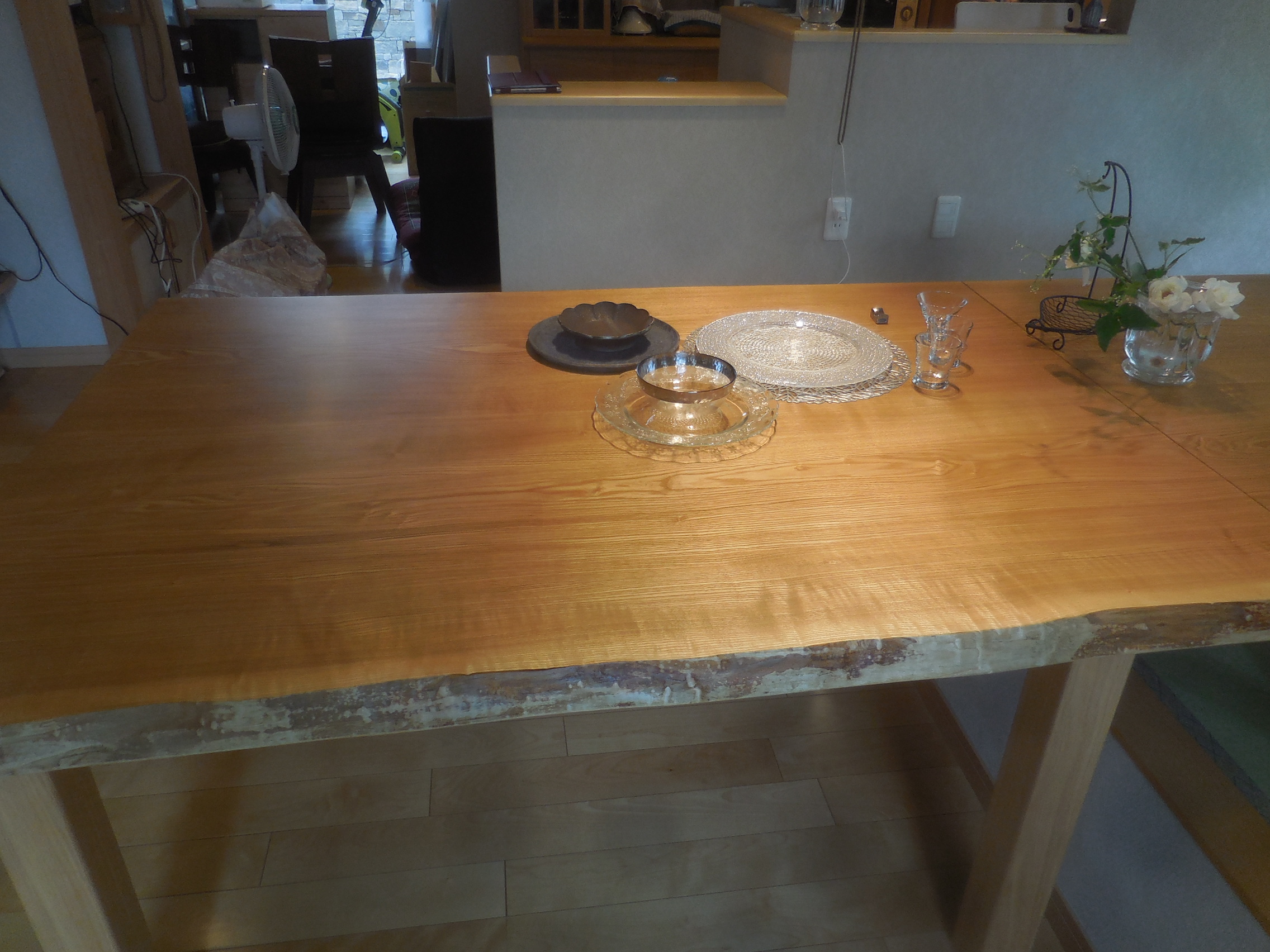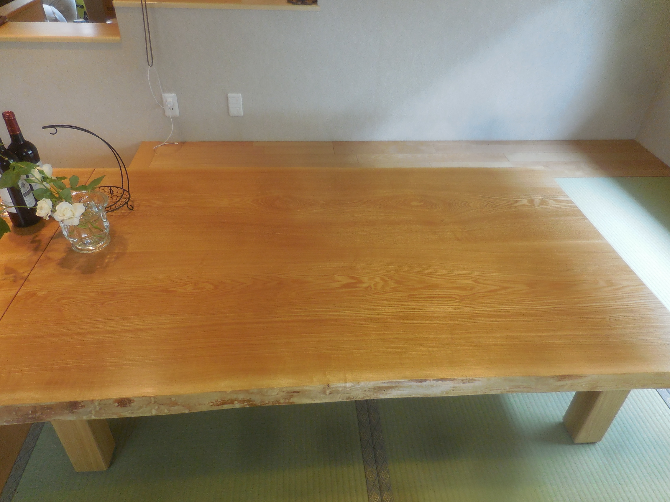 3mのタモ材の耳付き板を使ったダイニングテーブルと座卓