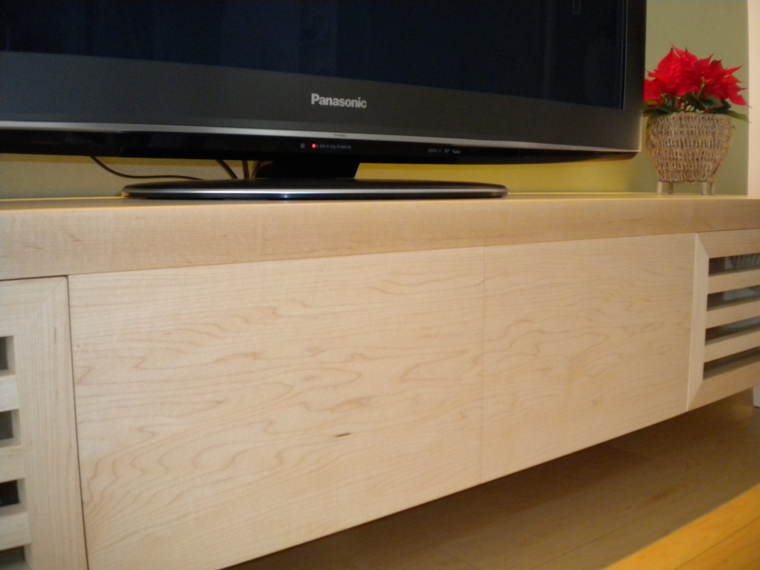 いつも作るテレビボードよりも天板は、厚くしてほしいということで天板は40mmで製作することになりました。メープル材は反りや捻じれが出やすい木材ですので、ゆっくりと乾燥させてから加工に入らせていただきました。