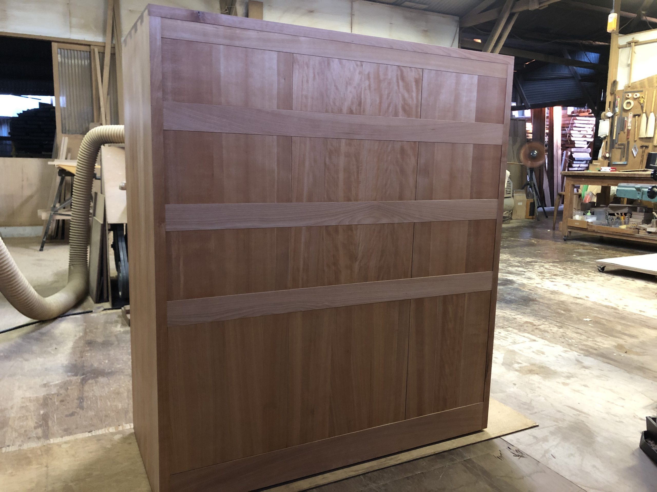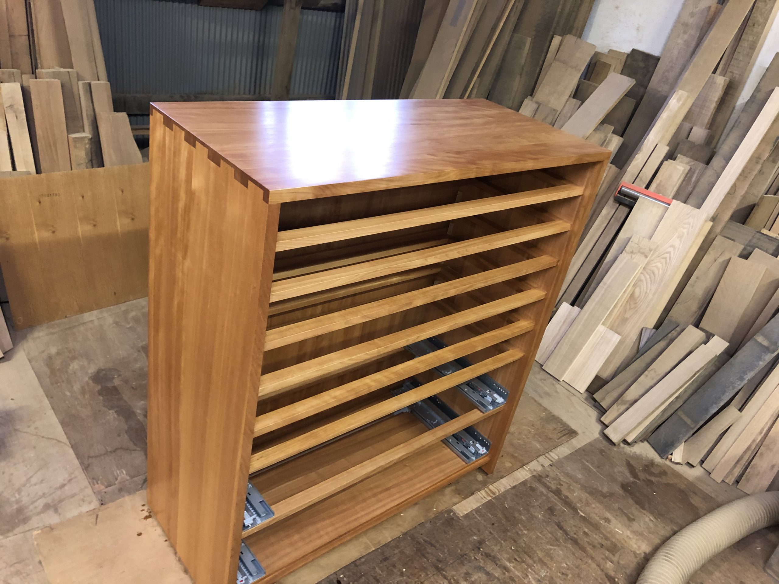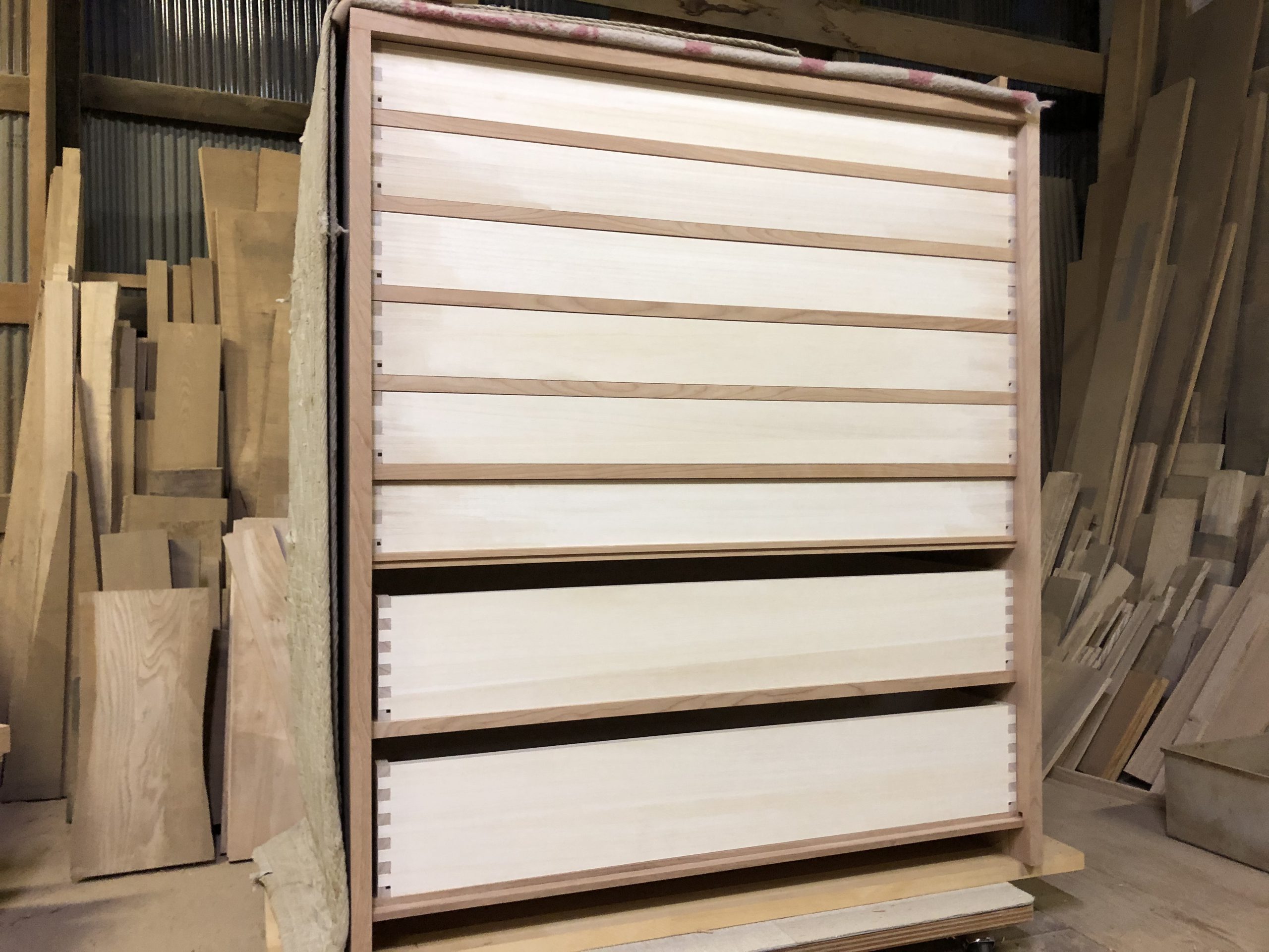 今回は、着物を入れられるということで抽斗の内部は桐材の集成材を使うことになりましたが、久しぶりの桐の集成材でなかなかやりにくいことが沢山です。