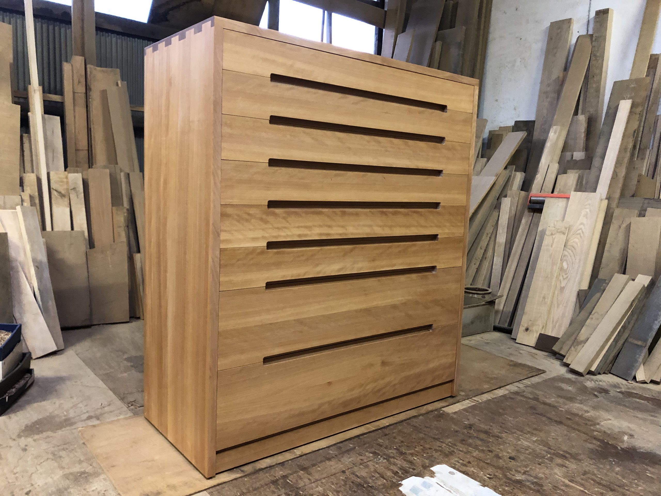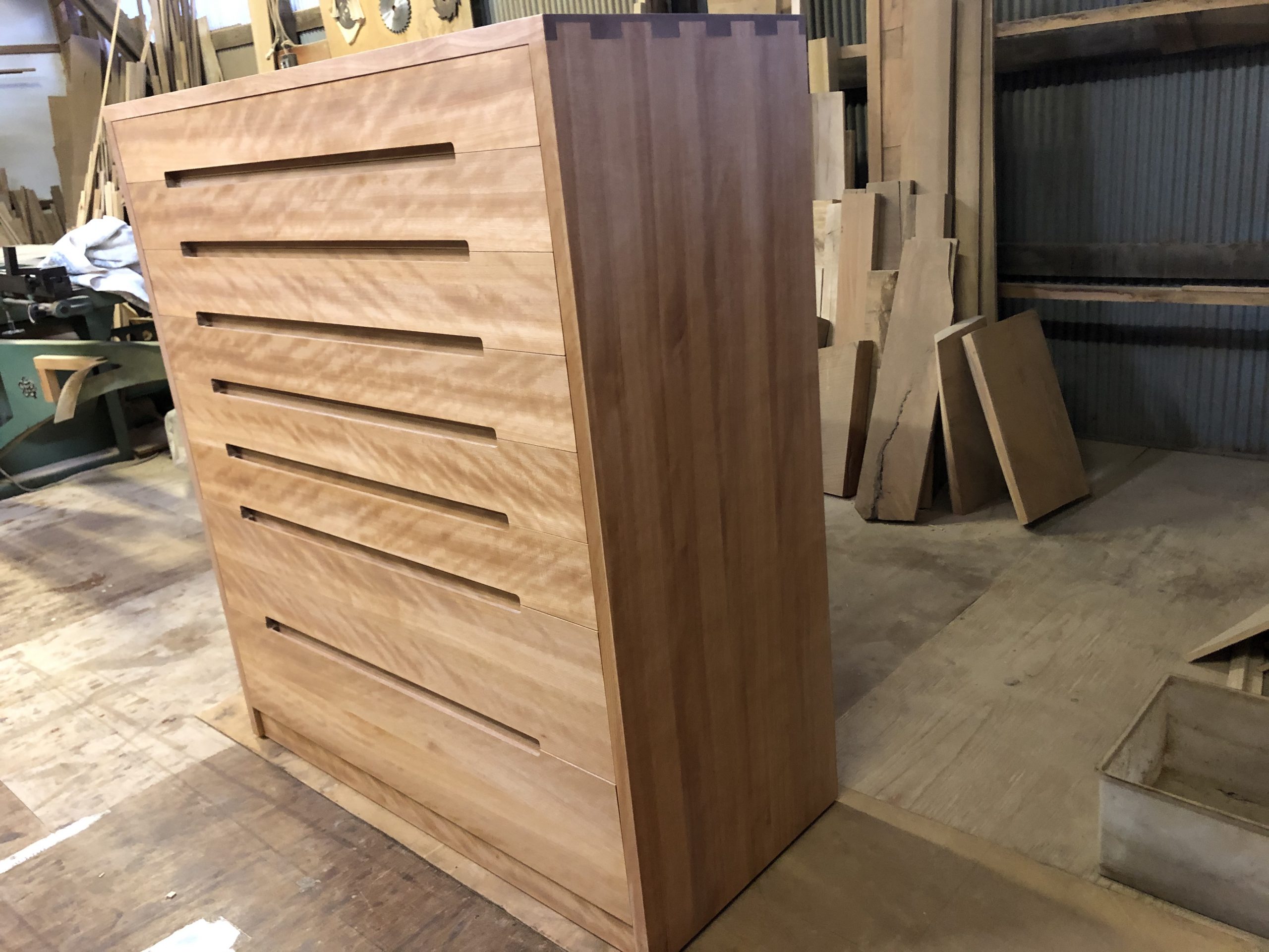 以前の樺材に色を気に入っていただき今回も真樺材を使うことになり、チェスト全体がなるべく色味の同じようになるように同じ木材から板材をとるようし、その板材を削ってみると大半のところに杢がでていて綺麗な木目を取ることができました。その中でも綺麗なところを抽斗の前板に使うようにしました。