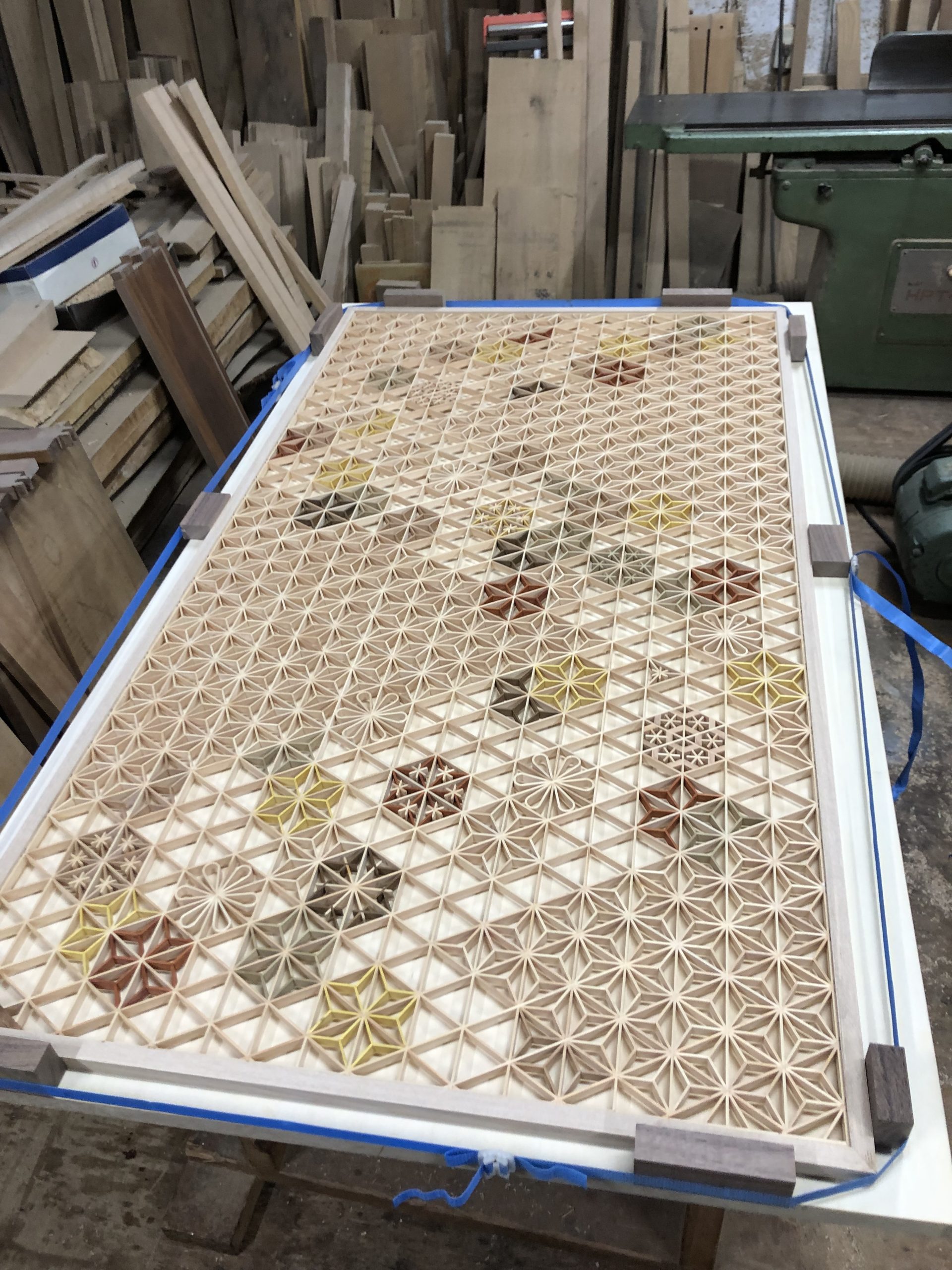 組子自体でしっかりとしているのかわからないですし、長く使うことを考えると組子にまず枠を作ってその枠ごと建具に組み込む方がしっかりとすると思い製作をしていきましたが、