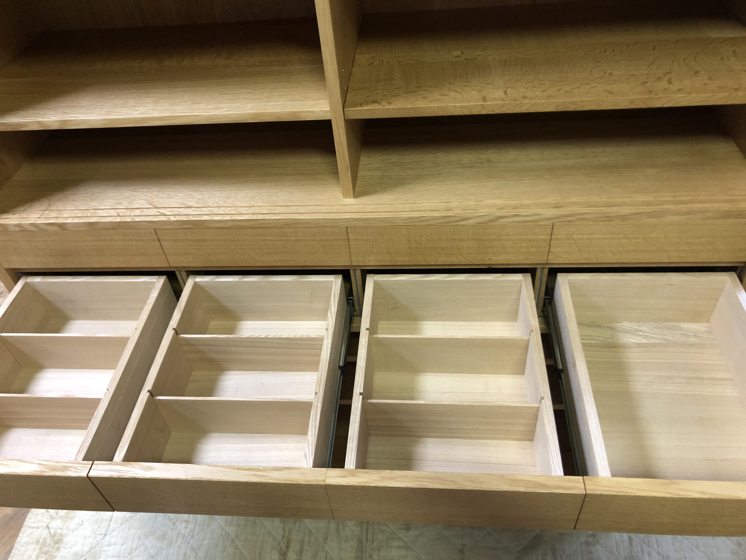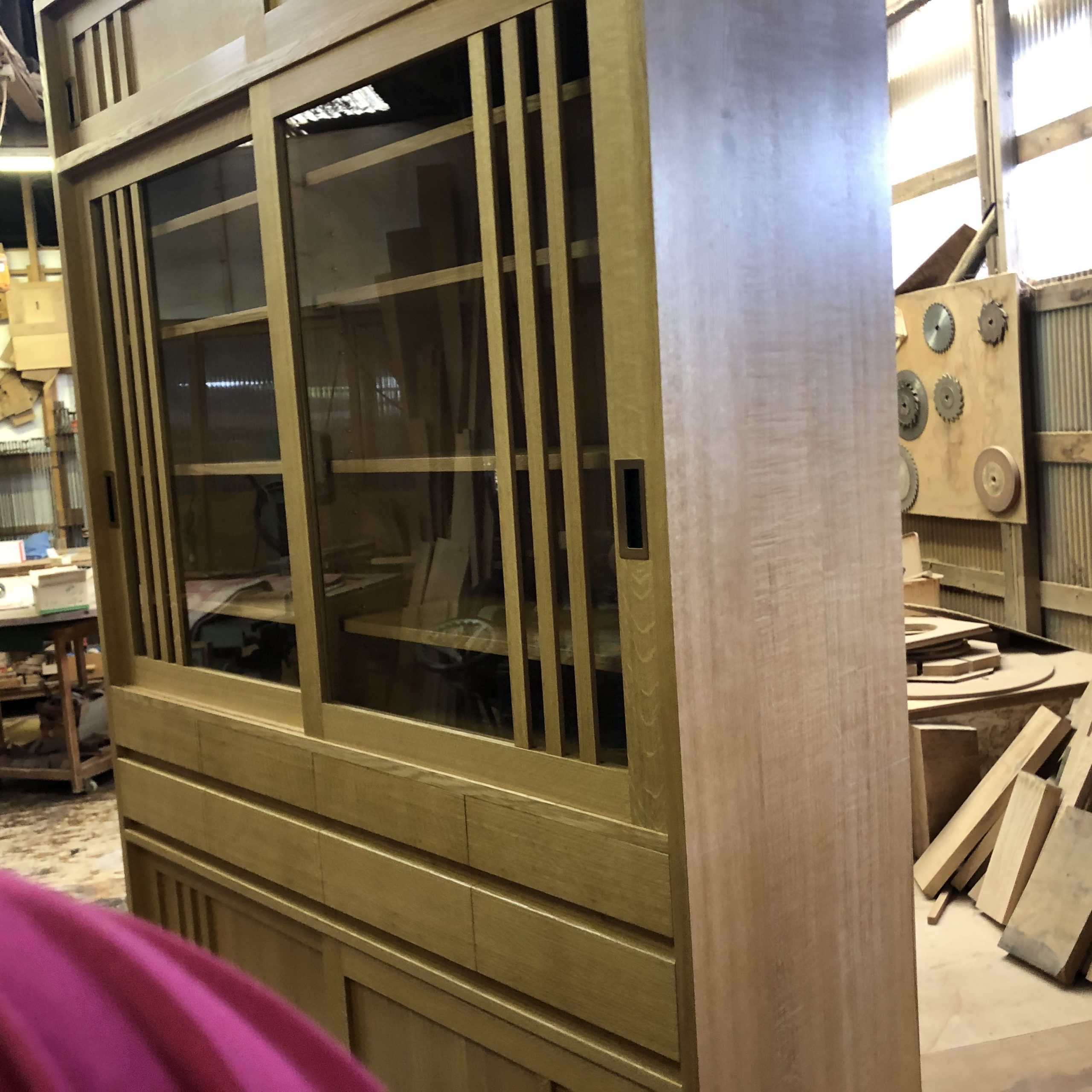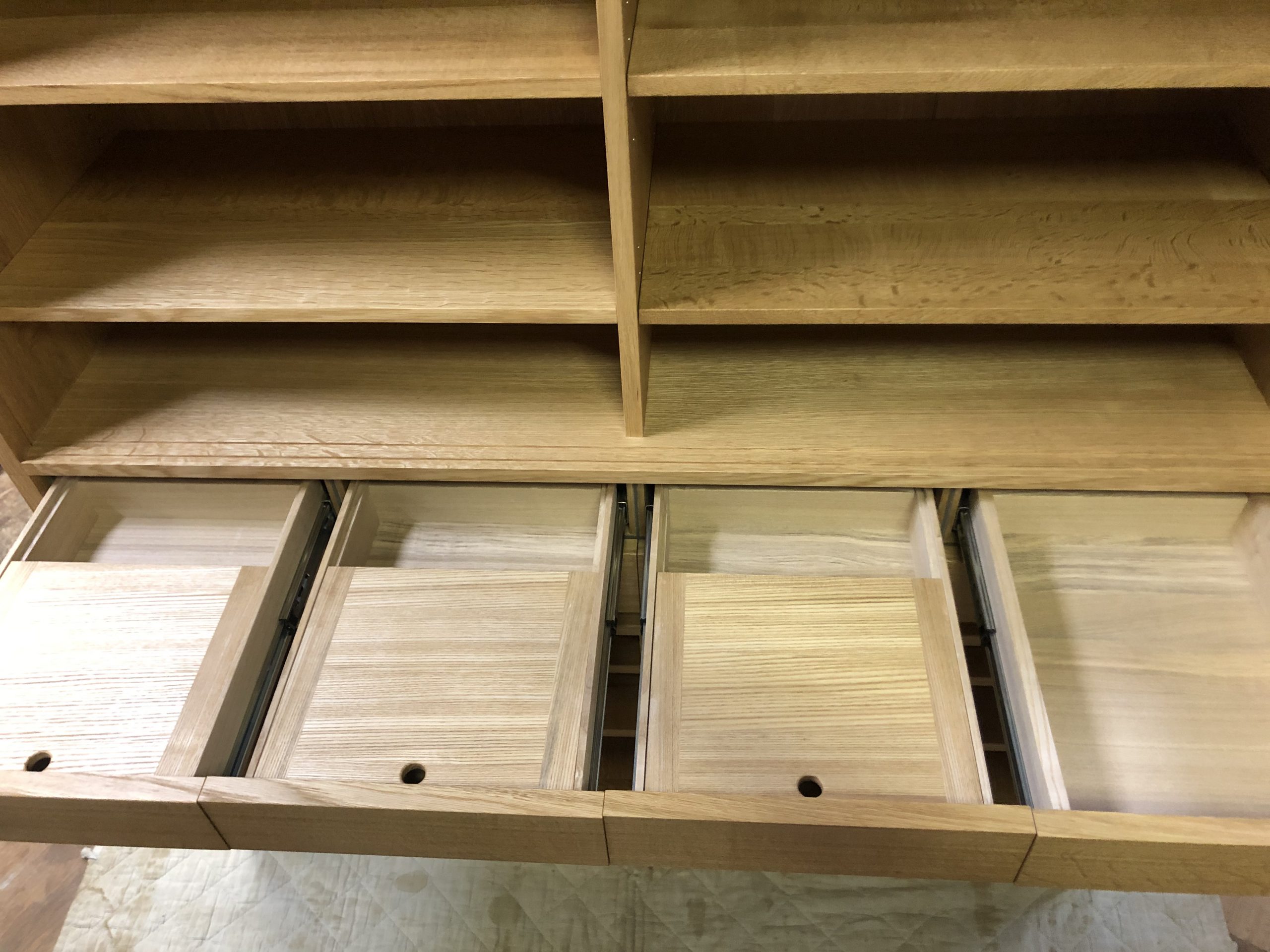 ですが、完成したときは、ホッとしました。抽斗と引き違い戸にはナラ材の斑の入った木材を使えて綺麗に仕上がったと思います。
