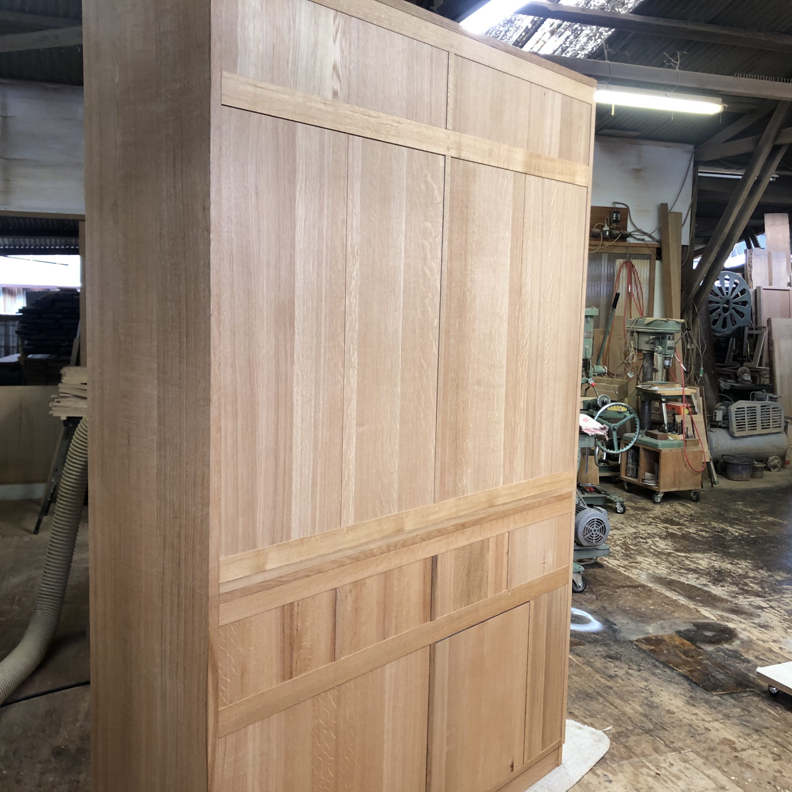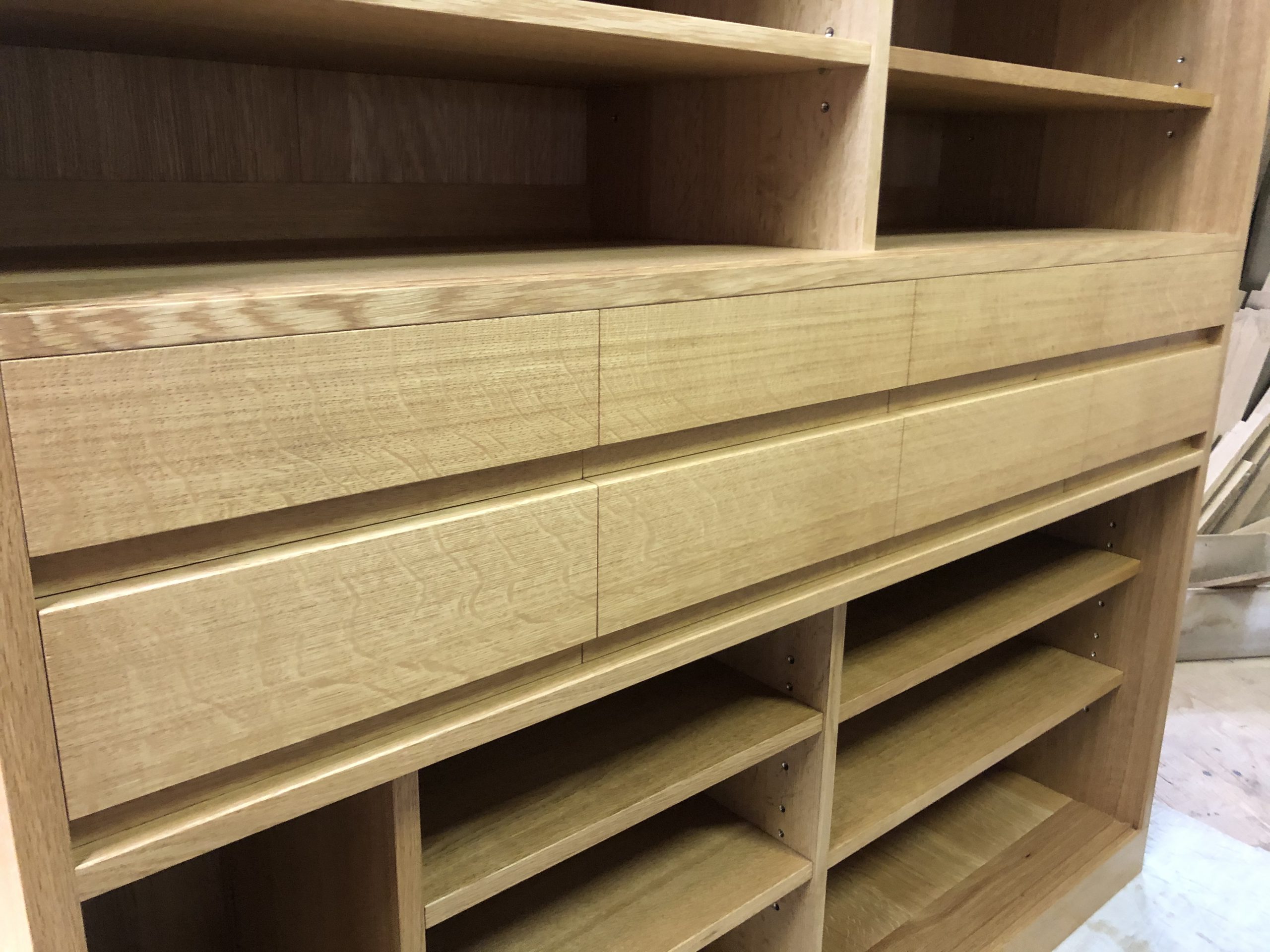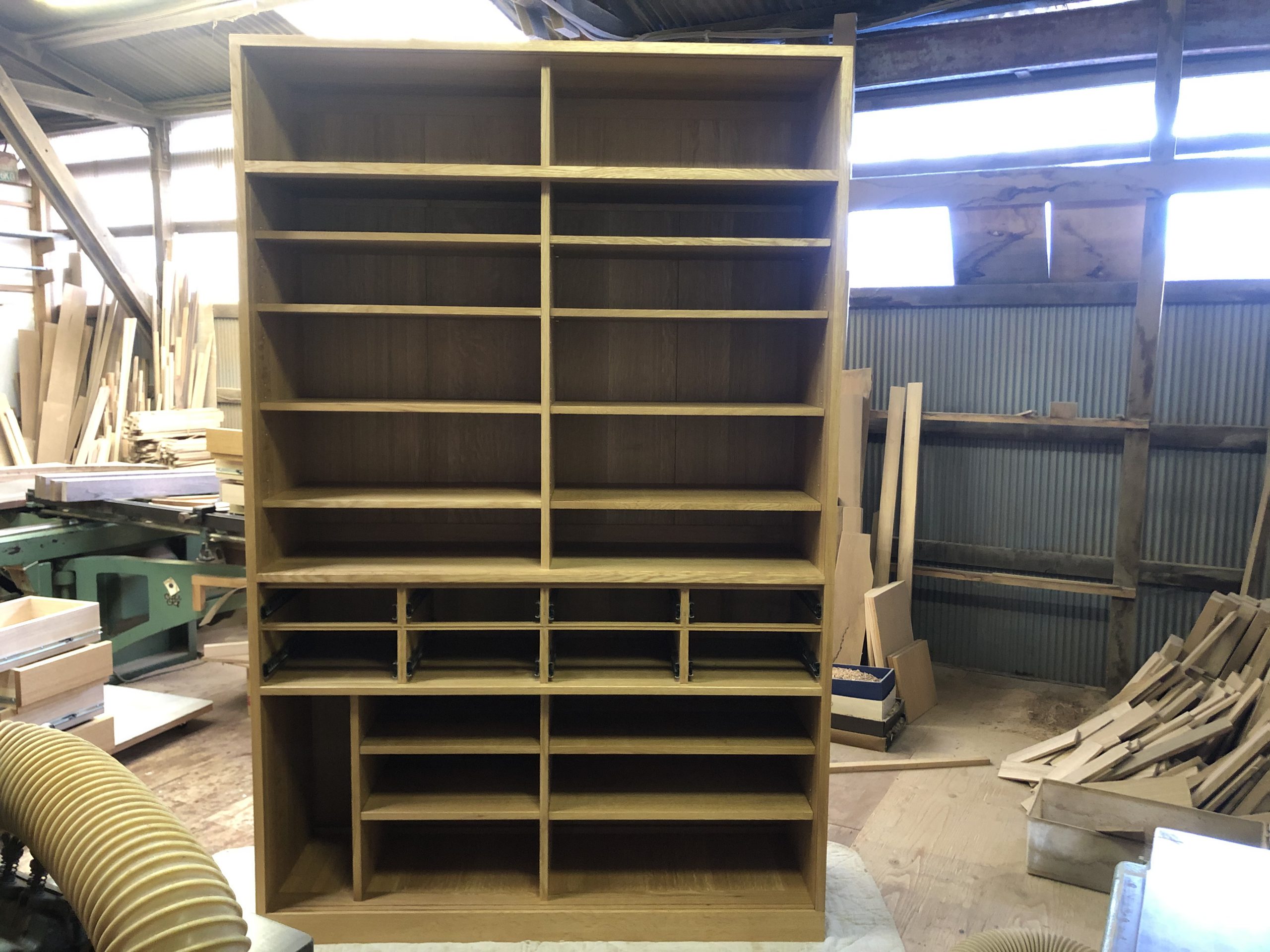 ですが、完成したときは、ホッとしました。抽斗と引き違い戸にはナラ材の斑の入った木材を使えて綺麗に仕上がったと思います。