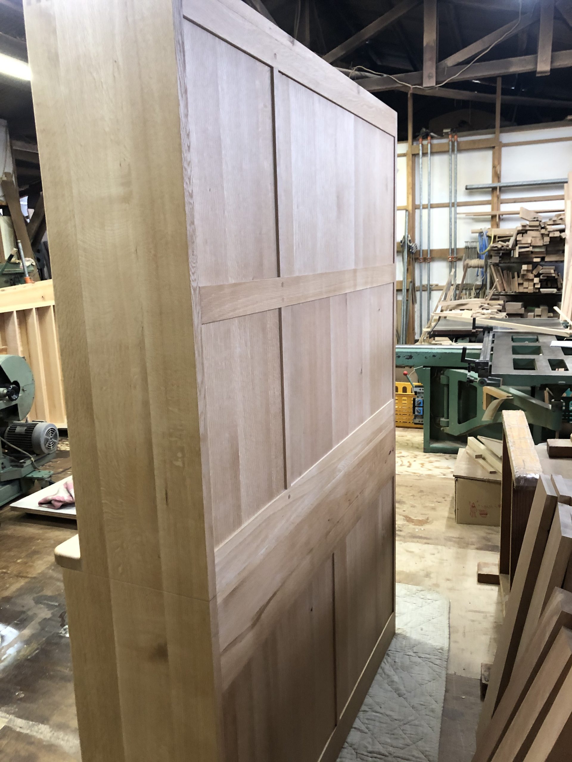 色目はなるべく濃い方がお好みだということで正面側の扉・引き戸はなるべく濃い色の一枚のナラ材から木取りをしたので、色目は大体合っていると思います。