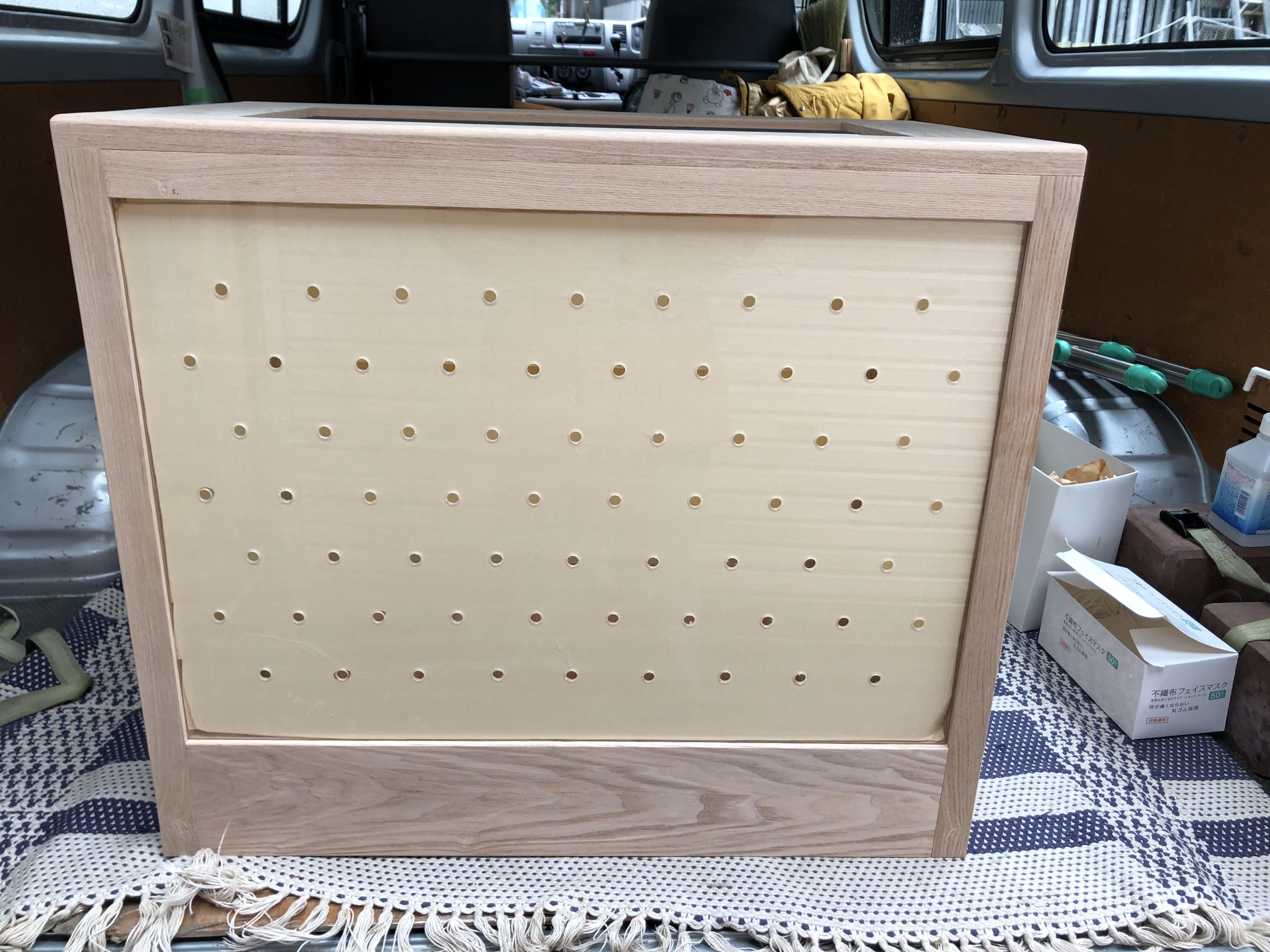 現物を持ってきていただき採寸させていただきました。以前の物とは、少し変更いたしましたが、、よく似た感じに仕上がったと思います。アクリル板に傷がつくのが嫌なので、養生を付けたまま納品させていただきましたので、完成はよくわからないですが。