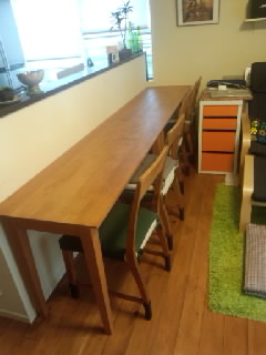 通常は、カウンターテーブルで使用され、人が集まるときは、2つのカウンターテーブルを合わせてダイニングテーブルみたいに使用されたいということでした。カウンターテーブルにした際少し奥行が足らないので、同材で奥行を足し2つのカウンターテーブルを製作させていただきました。